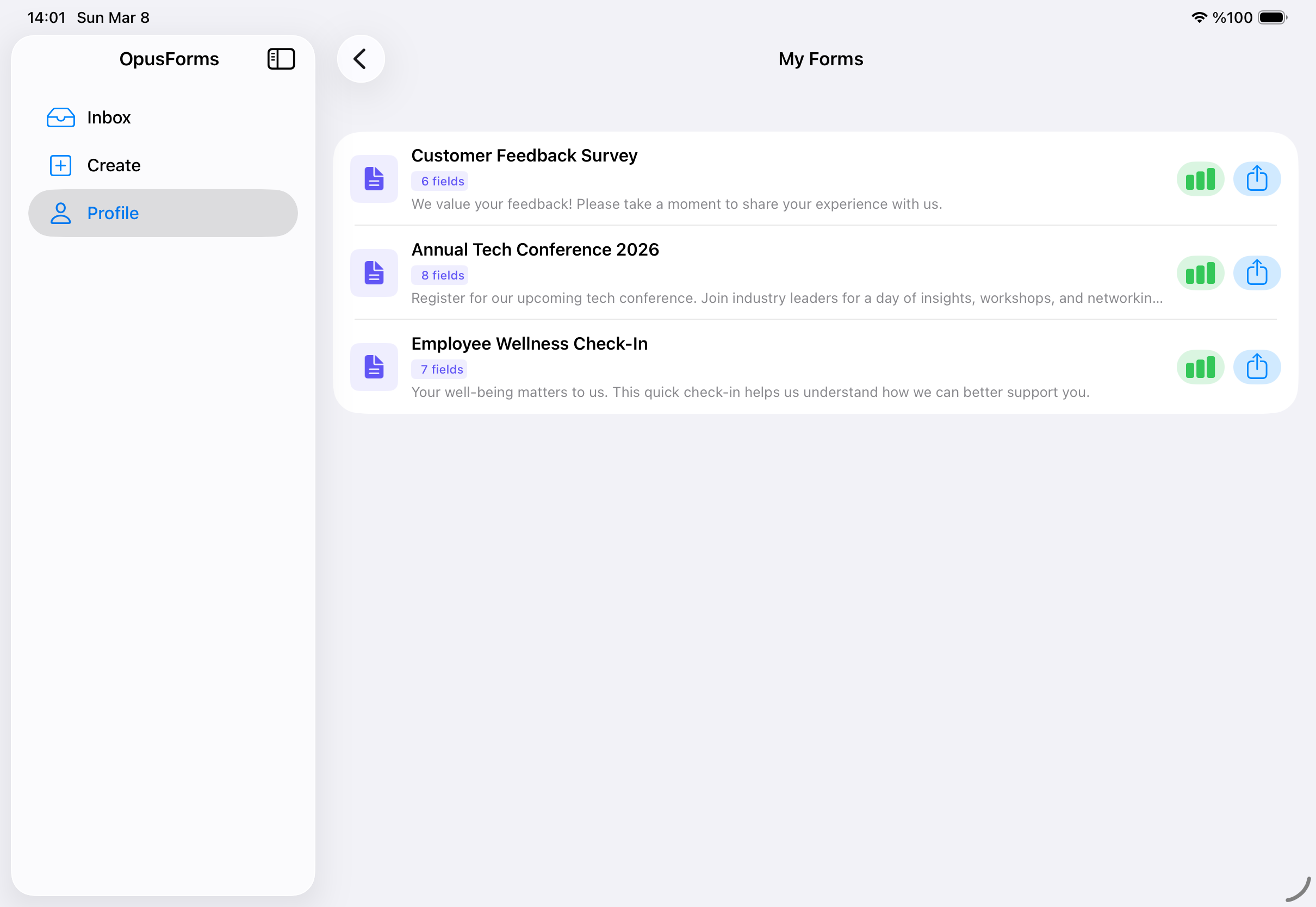 Create dynamic forms on your mobile devices with OpusForms. Design professional forms without writing any code and reach your audience instantly.